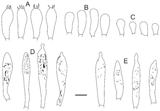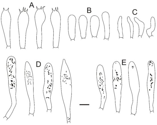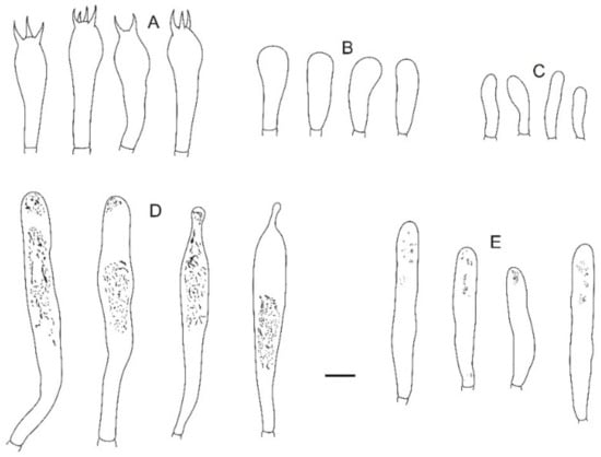 Microscopic features of Russula sinorobusta (BJTC Z052). (A) Basidia. (B) Basidiola. (C) Marginal cells. (D). Hymenial cystidia on lamellae sides. (E) Hymenial cystidia on lamellae edges. Scale bar: 10 μm.