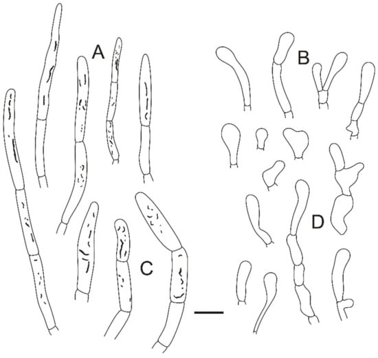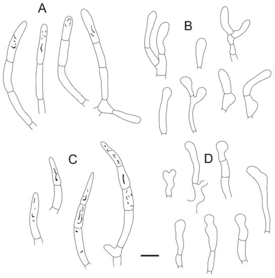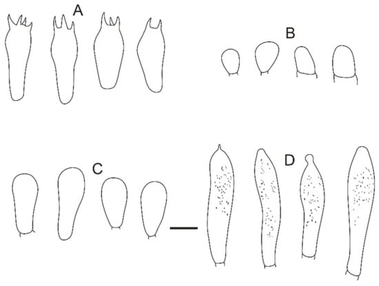 Microscopic features of Russula sinoparva (BJTC ZH441). (A) Basidia. (B) Basidiola. (C) Marginal cells. (D) Hymenial cystidia on lamellae sides. Scale bar: 10 μm.