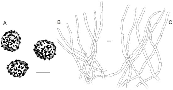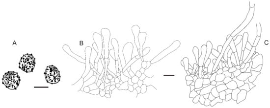 Microscopic features of Russula sinorobusta (BJTC Z052). (A) Basidiospores. (B) Hyphal terminations near the pileus margin. (C) Hyphal terminations near the pileus center. Scale bar: (A) = 5 μm; (B,C) = 10 μm.