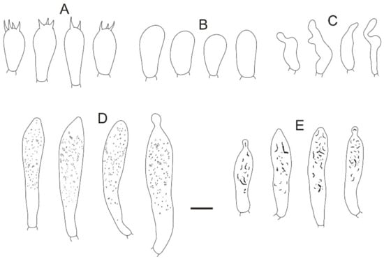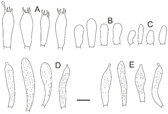 Microscopic features of Russula miyunensis (BJTC Z1355). (A) Basidia. (B) Basidiola. (C) Marginal cells. (D) Hymenial cystidia on lamellae sides. (E) Hymenial cystidia on lamellae edges. Scale bar: 10 μm.