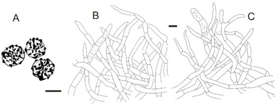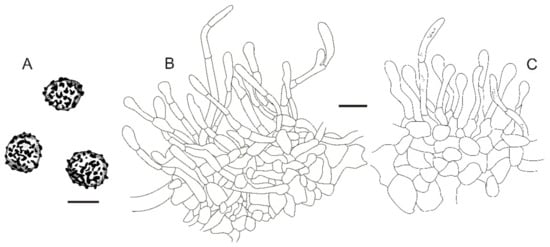 Microscopic features of Russula plana (BJTC Z1398). (A) Basidiospores. (B) Hyphal terminations near the pileus margin. (C) Hyphal terminations near the pileus center. Scale bar: (A) = 5 μm; (B,C) = 10 μm.