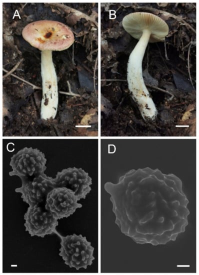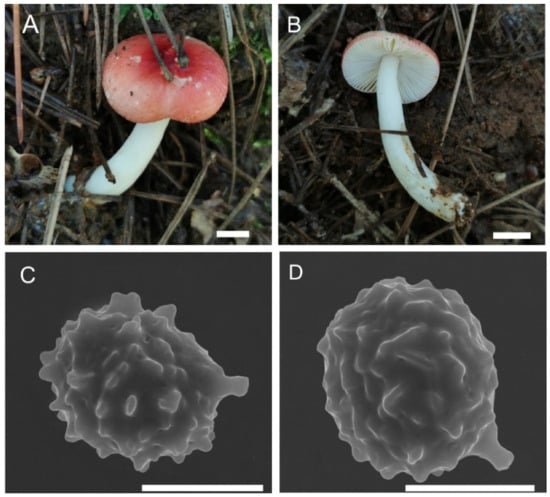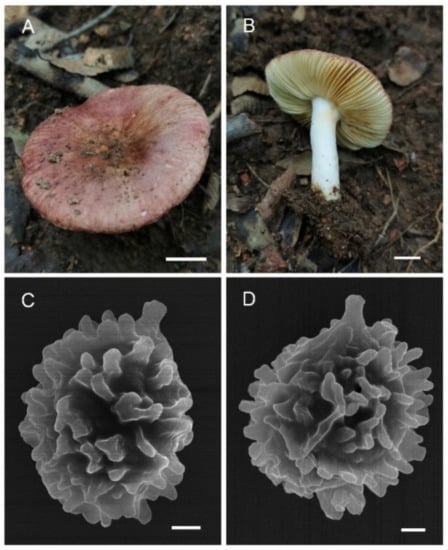 Russula sinoparva (BJTC ZH441). (A,B) Basidiomata. (C,D) Basidiospores. Scale bar: (A,B) = 10 mm, (C,D) = 5 μm.