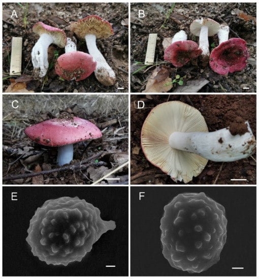 Russula miyunensis (BJTC Z1355). (A–D) Basidiomata. (E,F) Basidiospores. Scale bar: (A–D) = 10 mm, (E,F) = 1 μm.