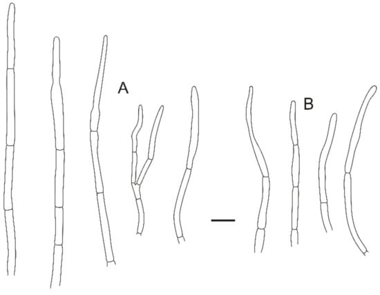 Microscopic features of Russula sinorobusta (BJTC Z052). (A) Hyphal terminations near the pileus margin. (B) Hyphal terminations near the pileus center. Scale bar: 10 μm.