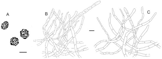 - White, T.J.; Bruns, T.; Lee, S.; Taylor, J. Amplifcation and direct sequencing of fungal ribosomal RNA genes for phylogenetics. PCR Protoc. A Guide Methods Appl. 1990, 18, 315–322. [Google Scholar] [CrossRef]