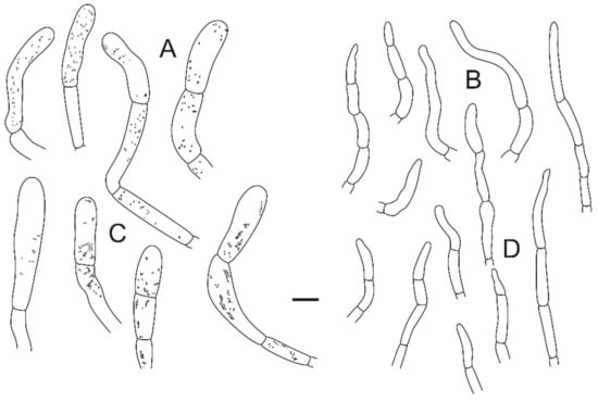 Microscopic features of Russula sinoparva (BJTC ZH441). (A) Pileocystidia near the pileus margin. (B) Hyphal terminations near the pileus margin. (C) Pileocystidia near the pileus center. (D) Hyphal terminations near the pileus center. Scale bar: 10 μm.