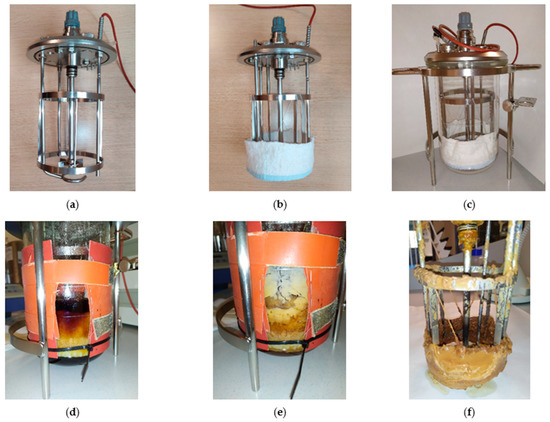 Immobilization process of M. pollinis MUCL 40570 on a cotton towel. (a) Rotor, baffle, sparger and lid of the reactor. (b) Attachment of the cotton towel to the baffle. (c) Assembled reactor. (d) Addition of grape must and fungal inoculation at the beginning of batch 0 (t = 0 h). (e) Biofilm development on the cotton towel at the end of batch 0 (t = 120 h). (f) Appearance of the cotton towel at the end of the experiment in batch 4 (t = 576 h post-inoculation).