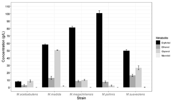 Although some bacteria such as Fructilactobacillus florum or Leuconostoc oenos can produce erythritol at low concentrations [10,11], fungal strains are preferred for erythritol bulk synthesis due to their higher productivity and proven safety [12,13,14]. In fact, the legislation of the European Union mentions, specifically, the use of Moniliella pollinis and M. megachiliensis for erythritol production for food applications [15].