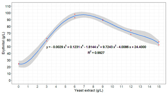 Effect of nitrogen dose (yeast extract) on erythritol production from grape must with M. pollinis MUCL 40570 after 120 h in flask experiments (n = 2). Note: Experimental observations are represented by red dots.