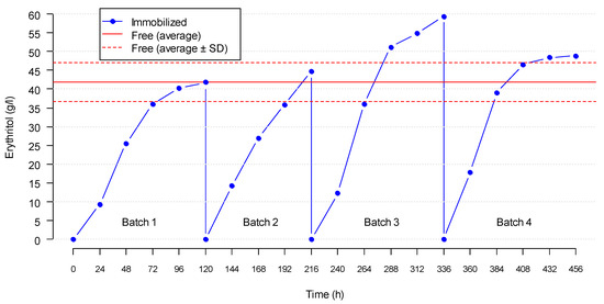 Evolution of erythritol production in the bioreactor with immobilized cells during four consecutive batches. Note: The horizontal lines represent the reference value with free cells (average ± standard deviation; 41.88 ± 5.18 g/L g/L erythritol).