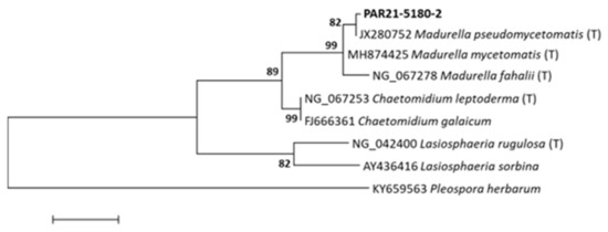 - Yan, J.; Deng, J.; Zhou, C.J.; Zhong, B.Y.; Hao, F. Phenotypic and Molecular Characterization of Madurella pseudomycetomatis sp. Nov., a Novel Opportunistic Fungus Possibly Causing Black-Grain Mycetoma. J. Clin. Microbiol. 2010, 48, 251–257. [Google Scholar] [CrossRef] [PubMed]