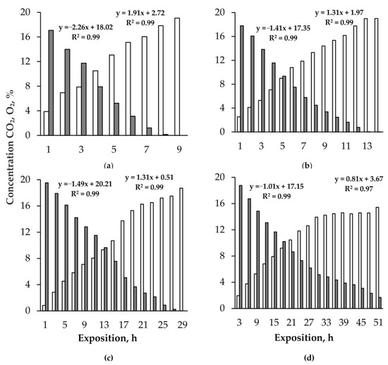 Dynamics of O2 consumption and CO2 accumulation in exposure chambers with basidiocarps Fomes fomentarius (a), Fomitopsis pinicola (b) and substrates Fomes fomentarius (c), Fomitopsis betulina (d). Dark columns—O2, light columns—CO2, R2—coefficient of determination.