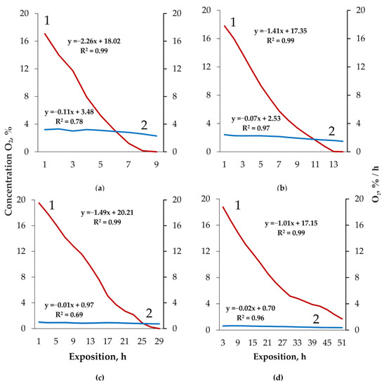 O2 concentration (1) and intensity of its consumption (2) by Fomes fomentarius (a), Fomitopsis pinicola (b) basidiocarps and Fomes fomentarius (c), Fomitopsis betulina (d) substrates. R2—coefficient of determination.