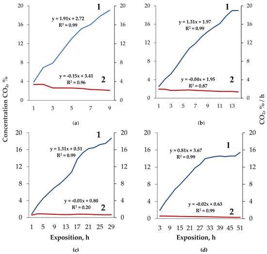 CO2 concentration (1) and intensity of its emission (2) by Fomes fomentarius (a), Fomitopsis pinicola (b) basidiocarps and Fomes fomentarius (c), Fomitopsis betulina (d) substrates. R2—coefficient of determination.