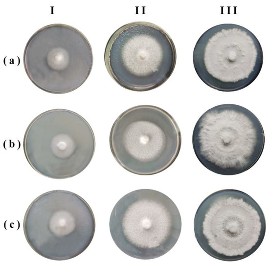 Growth of dikaryotic mycelium of Daedaleopsis septentrionalis in 100% CO2 (a) and in 100% N2 (b). I—initial size, II—after 3 days exposure in oxygen-free medium, III—after the next 3 days in air; control in air (c), initial size (I), after 3 (II) and 6 (III) days in air.