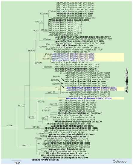 - Zhang, W.; Nan, Z.B.; Tian, P.; Hu, M.J.; Gao, Z.Y.; Li, M.; Liu, G.D. Microdochium paspali, a new species causing seashore paspalum disease in southern China. Mycologia 2015, 107, 80–89. [Google Scholar] [CrossRef]