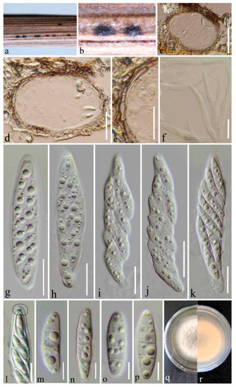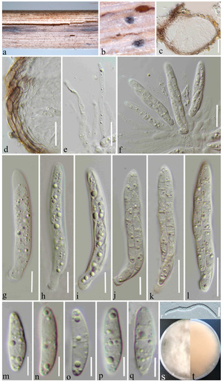 - Thambugala, K.M.; Wanasinghe, D.N.; Phillips, A.J.L.; Camporesi, E.; Bulgakov, T.S.; Phukhamsakda, C.; Ariyawansa, H.A.; Goonasekara, I.D.; Phookamsak, R.; Dissanayake, A.; et al. Mycosphere notes 1–50: Grass (Poaceae) inhabiting. Mycosphere 2017, 8, 697–796. [Google Scholar] [CrossRef]