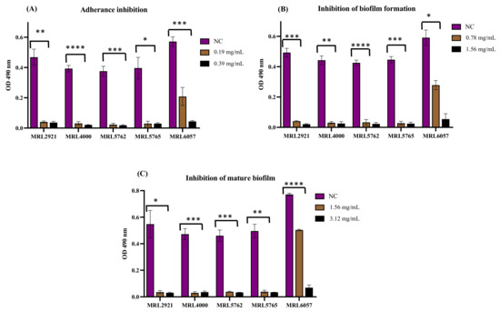 - Pierce, C.G.; Uppuluri, P.; Tristan, A.R.; Wormley, F.L.; Mowat, E.; Ramage, G.; Lopez-Ribot, J.L. A simple and reproducible 96-well plate-based method for the formation of fungal biofilms and its application to antifungal susceptibility testing. Nat. Protoc. 2008, 3, 1494–1500. [Google Scholar] [CrossRef]