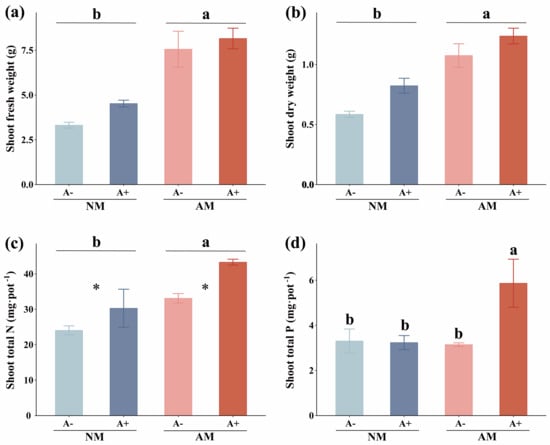 (a) Shoot fresh weight, (b) Shoot dry weight, (c) Shoot total N, and (d) Shoot total P of M. sativa inoculated with R. intraradices (AM) and infested by A. pisum (A+) or without inoculation with R. intraradices (NM) and non-infested with A. pisum (A−). All values are shown as means ± SEM of four biological replicates. Different letters above bars (d) or pairs of bars (a–c) represent significant difference in the comparison at p < 0.05, asterisks indicate significant differences between A− and A−, as determined by a Tukey’s HSD test. SEM, standard error of the mean.