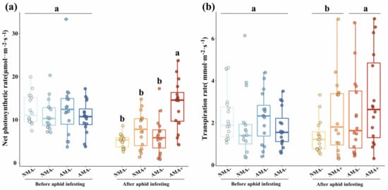 (a) Net photosynthetic rate and (b) transpiration rate of M. sativa inoculated with R. intraradices (AM) and infested by A. pisum (A+) or without inoculation with R. intraradices (NM) and un-infested by A. pisum (A−) before aphid infesting and after aphid infesting. Boxes show first quartile, median, and third quartile. Whiskers extend to the most extreme points within 1.5 × box lengths, and the points are values that fall outside the whiskers. Different letters above bars or pairs of bars represent significant difference between different treatments before aphid infesting or after aphid infesting in the comparison at p < 0.05, as determined by a Tukey’s HSD test.
