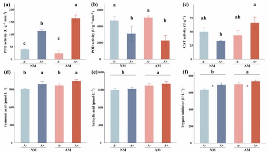 (a) PPO activity, (b) POD activity, (c) CAT activity, (d) JA concentration, (e) SA concentration, and (f) Trypsin inhibitor concentration of M. sativa inoculated with R. intraradices (AM) and infested by A. pisum (A+) or without inoculation with R. intraradices (NM) and non-infested with A. pisum (A−). All values are shown as means ± SEM of four biological replicates. Different letters above bars (a–d) or pairs of bars (e,f) represent significant difference in the comparison at p < 0.05, asterisks indicate significant differences between A− and A−, as determined by a Tukey’s HSD test. SEM, standard error of the mean. PPO, polyphenol oxidase; POD, peroxidase; CAT, catalase; JA, jasmonic acid; SA, salicylic acid.