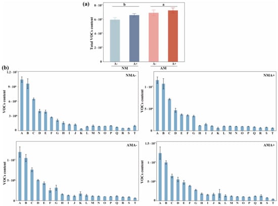 (a) Total VOC content from M. sativa inoculated with R. intraradices (AM) and infested by A. pisum (A+) or without inoculation with R. intraradices (NM) and non-infested with A. pisum (A−). All values are shown as means ± SEM of four biological replicates. Different letters above pairs of bars represent significant difference in the comparison at p < 0.05 (b) Individual VOCs’ contents in NMA−, NMA+, AMA−, AMA+ treatments. Means ± SEM for the 20 most abundant compounds. The same compounds are present in each treatment, and the relative contents of compounds are similar. A, 2-Hexenal, (E)−; B, 2-Ethyl-1-hexanol; C, 3-Buten-2-one, 4-(2,6,6-trimethyl-1-cyclohexen-1-yl)-; D, 2,4-Heptadienal, (E,E)-; E, 1-Hexanol; F, Hexanal; G, 3-Buten-2-one, 4-(2,2,6-trimethyl-7-oxabicyclo[4.1.0]hept-1-yl)-; H, 3,5-Octadien-2-one; I, 1-Octen-3-ol; J, Phenylethyl Alcohol; K, 2-Penten-1-ol, (Z)−; L, Benzyl alcohol; M, 1-Cyclohexene-1-carboxaldehyde, 2,6,6-trimethyl-; N, Cyclohexanol; O, 4-Heptanone, 2,6-dimethyl-; P, Pentadecane; Q, Benzaldehyde; R, 2,6-Nonadienal, (E,Z)−; S, Cyclohexanol, 2,6-dimethyl-; T, Octanoic acid, ethyl ester.