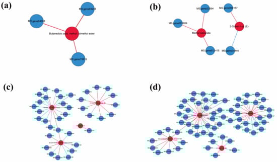 Co-expression network and expression profiles for each module of differentially expressed genes and differentially expressed VOCs in (a) NMA− vs. AMA−, (b) NMA− vs. NMA+, (c) AMA- vs. AMA+, (d) NMA+ vs. AMA+. Nodes colored in ‘red’ and ‘blue’ represent DEMs and differentially expressed VOCs. Edges colored in ‘red’ and ‘blue’ represent positive and negative correlations. VOCs, volatile organic components.