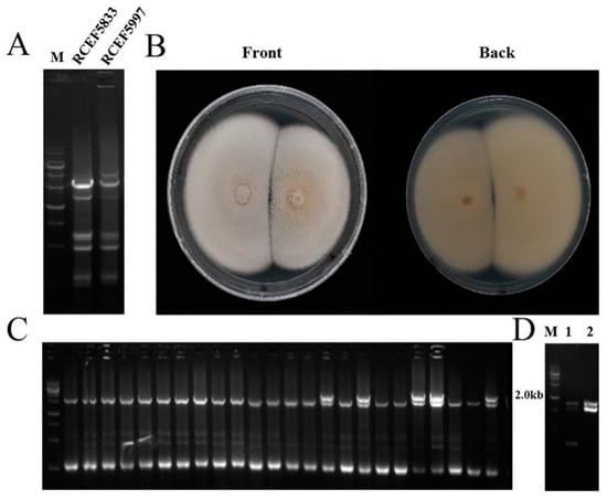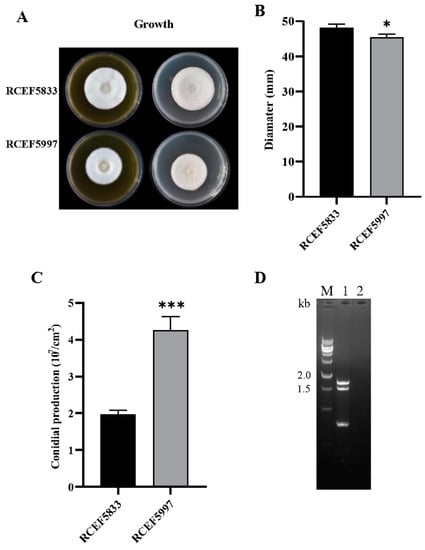 Fungal development and virus infection of Cordyceps chanhua strains. (A) Colony morphology of C. chanhua strains RCEF5997 and RCEF5833 on PDA medium. (B) Diameters of strains grown on SDAY for 10 days. (C) Sporulation capacity of strains RCEF5997 and RCEF5833 growing on PDA medium after 10 days. (D) Electrophoresis of purified dsRNAs extracted from C. chanhua strains RCEF5997 and RCEF5833 in a 1.5% agarose gel. M, DNA marker; lane 1, dsRNA segments of RCEF5997; lane 2, RCEF5833 did not possess any dsRNA. * p < 0.05, *** p < 0.001.