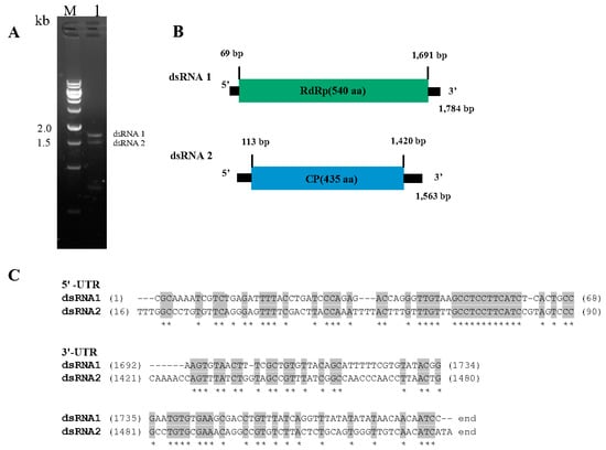Characterization of CchPV1. (A) Electrophoresis of purified dsRNAs extracted from Cordyceps chanhua RCEF5997 in a 1.5% agarose gel. M, DNA marker; lane 1, dsRNA segments of RCEF5997. (B) Schematic representation of CchPV1. (C) Sequence alignment information of 5’-UTR and 3’-UTR of CchPV1 (ClustalX was used for sequence alignment). An asterisk indicates a position with a single, fully conserved residue. Colons and periods indicate conservation between groups with strongly similar properties (scoring > 0.5) and weakly similar properties (scoring ≤ 0.5), respectively, in the Gonnet PAM 250 matrix.