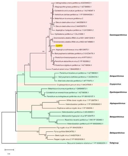 To determine the phylogenetic relationship of CchPV1 with other partitiviruses, an ML phylogenetic tree was constructed on the basis of RdRp amino-acid sequences using Beauveria bassiana victorivirus 1 as an outgroup. The phylogeny inferred from the alignment showed seven different clades with high bootstrap support representing five recognized genera, namely, Alphapartitivirus, Betapartitivirus, Deltapartitivirus, Gammapartitivirus, and Cryspovirus, and two proposed genera, “Epsilonpartitivirus” and “Zetapartitivirus”. Moreover, the ML phylogenetic tree revealed that CchPV1 grouped with members of the genus Gammapartitivirus and sorted with the other genera of the family Partitiviridae.