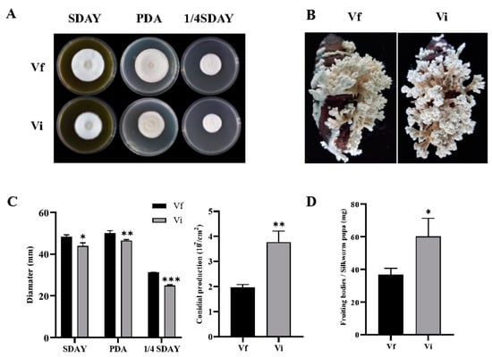 Fungal development of Vf and Vi strains. (A) Colony morphology of strains Vf and Vi growing on different media. (B) The growth of asexual fruiting on Chinese tussah silkworm pupae. (C) Left: diameters of strains grown for 10 days on PDA, SDAY, and 1/4 SDAY, respectively; Right: sporulation of the strains after 10 days of growth. (D) The production of the fruiting bodies of 1 g of pupae produced by Vi and Vf strains. * p < 0.05, ** p < 0.01, *** p < 0.001.