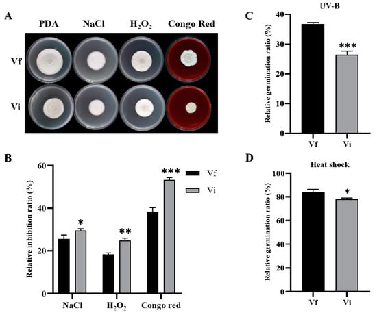 Resistance of strains to stress. (A) Colony morphology of Vf and Vi in PDA containing different chemicals. (B) The relative inhibition rate of the strains cultured on the medium containing NaCl, H2O2, and Congo Red after 10 days. (C) Relative germination rate of strains after 24 h UV-B irradiation. (D) The relative germination rate of strains at 40 °C heat shock after 24 h. * p < 0.05, ** p < 0.01, *** p < 0.001.