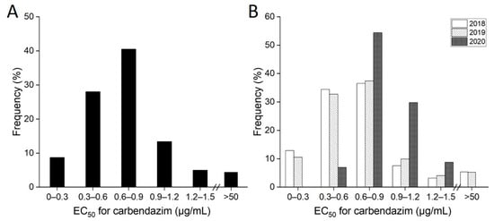 The frequency distribution of the EC50 values for carbendazim was unimodal (Figure 2A). In terms of years, although no resistant isolates were detected in 2020, the proportion of isolates insensitive to carbendazim in 2020 was higher than those in 2018 and 2019 (Figure 2B).