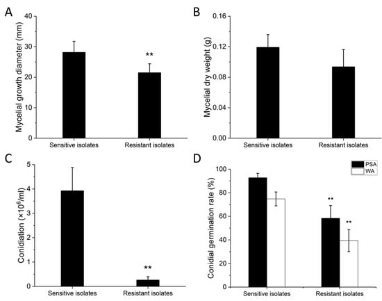 Mycelial growth diameters of 14 resistant isolates and 5 sensitive isolates were determined on fungicides-free PSA plates. Mycelium plugs (4 mm in diameter) taken from the periphery of 14-day-old cultures were transferred to new PSA plates and incubated at 27 °C in the dark. The colony diameters were measured after 14 days, with three replicates per isolates. Fourteen-day-old mean colony diameters of all resistant isolates or sensitive isolates were calculated as mycelial growth diameters. For conidiation test and measurement of conidia germination, after isolates were cultured on PSA at 27 °C for 14 days, two 4 mm diameter mycelia plugs were transferred into 50 mL of PSB, and the conidiation was counted with a hemocytometer after shaking at 27 °C, 150 rpm for 7 days. The mycelial were collected by filtration through two layers of gauze and measured for dry weight after drying at 50 °C in an oven for 3 days. To measure conidial germination rate, mycelial were removed by filtration and the conidia were collected from the filtrate by centrifugation at 7000× g for 5 min. The conidia were washed twice by resuspension in sterile distilled water, in which they were finally resuspended and adjusted to a concentration of 1.0 × 105 conidia/mL. Then, 100 μL conidia suspension was spread on the surface of PSA or WA (water agar: 15 g agar per liter water) plates, and the plates were incubated at 27 °C in the dark for 24 h. The conidial germination rate was recorded with a Nikon E200 microscope. Conidia was regarded as germinated when the germ tube length exceeded half the conidia length. Germination was quantified by counting at least 200 conidia per plate for each isolate. Each isolate was repeated three times and each experiment was conducted twice.