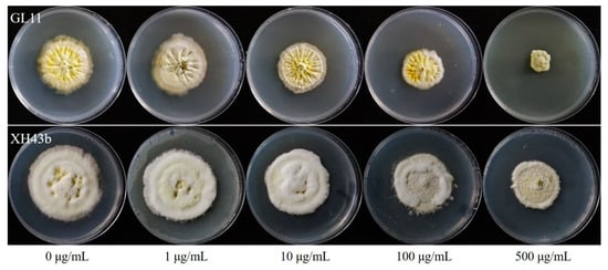 Sensitivity of resistant isolates GL11 and XH43b to carbendazim after 5 transfers (T5) on fungicide-free PSA. Photos were taken after 28 days of incubation at 27 °C in the dark.