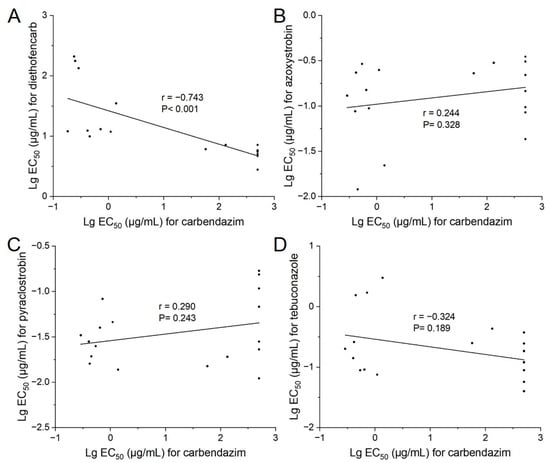 Correlation of log10-transformed concentration at which mycelial growth is inhibited 50% (EC50) values of Ustilaginoidea virens isolates for carbendazim and (A) diethofencarb, (B) azoxystrobin, (C) pyraclostrobin, and (D) tebuconazole.