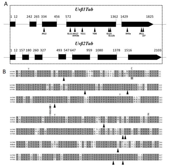 Schematic gene structure and alignments of Ustilaginoidea virens Uvβ1Tub and Uvβ2Tub. (A) Uvβ1Tub from twenty-three carbendazim-sensitive isolates is 1825 bp in size interrupted by four introns (with exons from 1–12, 242–265, 334–456, 572–1362, and 1429–1825). Locations of Uvβ1Tub variations in carbendazim-resistant isolates are marked with arrows. Uvβ2Tub from carbendazim-sensitive isolates is 2103 bp in size interrupted by six introns (with exons from 1–12, 157–180, 260–327, 493–547, 647–959, 1080–1378, and 1516–2103). Number indicates nucleotide position of the gene. (B) Alignments of β-tubulin amino acid sequences from Ustilaginoidea virens and Aspergillus nidulans. The sequences of deduced amino acids of β-tubulin from A. nidulans from the NCBI GenBank database AAA3328.1. The shaded letters indicate the conserved residues. Letters above the sequences: substitution amino acids in β2Tub from other resistant field isolates []. Letters under sequences: substitution amino acids in β1Tub from resistant laboratory mutants [,]. The codon positions where mutations occurred in Uvβ1Tub are marked with arrows.