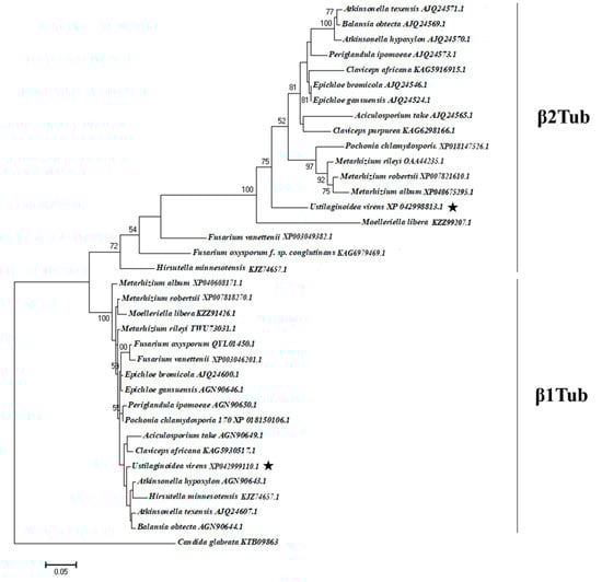 A phylogenetic tree was constructed on the basis of the concatenated alignment of β-tubulin homologs of U. virens and other ascomycete fungi that are close to U. virens, including the outgroup fungus Candida glabrata (Figure 7). There were a total of 443 positions in the final data set. Maximum likelihood phylogenetic analyses of the predicted amino acid sequences for these two proteins (β1Tub and β2Tub) with sequences for 36 Tub genes from ascomycete species resolved two distinct clades, with β1Tub and β2Tub forming two monophyletic clades. Results confirmed that Uvβ1Tub and Uvβ2Tub were homologous to the β1Tub and β2Tub proteins from multiple other fungi, respectively.