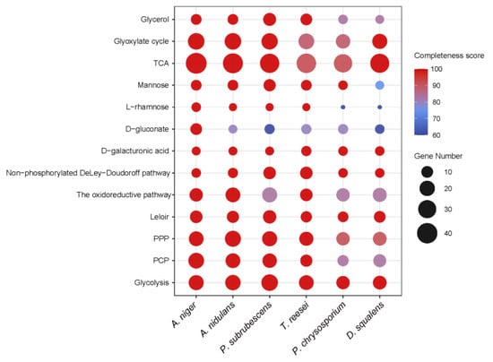 Conservation of sugar metabolic pathways among A. niger, A. nidulans, T. reesei, P. subrubescens, P. chrysosporium and D. squalens. The size of the dots indicates the number of genes involved in each pathway, and the color indicates the completeness of the pathway. The completeness score of a pathway is defined as the percentage of predicted reactions in a studied fungus compared to the total reactions reported in A. niger for each specific sugar metabolic pathway.
