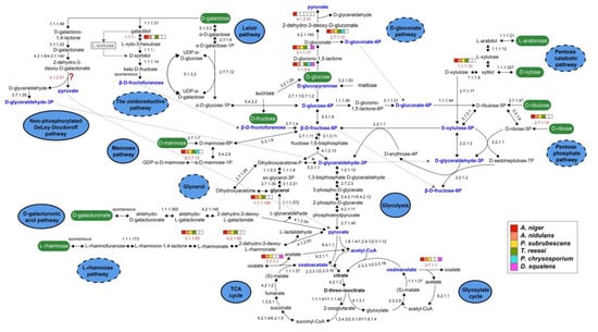 In this study, we aimed to transfer the sugar metabolic model of A. niger to five taxonomically diverse fungi (Aspergillus nidulans, Penicillium subrubescens, Trichoderma reesei, Phanerochaete chrysosporium and Dichomitus squalens) using an orthology-based approach. In addition, we filtered out the potential pseudogenes and compared the expression profiles of the predicted enzyme-encoding genes based on transcriptomic, proteomic and metabolomic data of fungi grown on diverse sugars and partially validated the predicted sugar catabolic pathways with fungal growth profiles on the corresponding sugars.