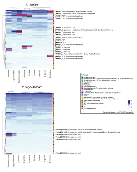 Expression profiles of sugar metabolism-related genes in A. nidulans and P. chrysosporium during their growth on diverse monosaccharides. The blue color from light to dark indicates a gene expression level from low to high. Selected genes with specific sugar-induced expression patterns are marked with a red box on the heatmap, and their gene IDs and the associated pathways are displayed. On the right bar, different colors indicate different pathways.