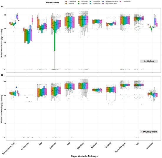 Protein abundance profiles of the sugar metabolism-related proteins involved in each sugar metabolic pathway in A. nidulans (A) and P. chrysosporium (B). On the boxplot, different colors indicate different monosaccharide growth conditions, and each small circle indicates an individual protein related to each specific sugar metabolic pathway. The metabolic enzymes that were detected in less than one-third of the tested growth conditions were not included in the boxplots. The y-axis represents the abundance of proteins (log2 scaled), and the x-axis depicts different sugar metabolic pathways.