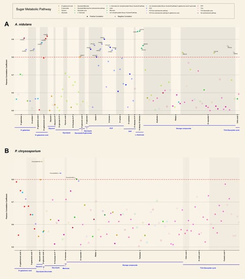 Correlation between the abundance of metabolites and sugar metabolism-related genes in A. nidulans (A) and P. chrysosporium (B). The y-axis represents Pearson correlation coefficient (PCC ≥ 0.5), and x-axis depicts different metabolites and the related sugar metabolic pathways (highlighted in blue). Each dot represents a gene, and its color indicates the corresponding sugar pathway in which it is involved. The positive and negative correlations were shown in filled and open circles, respectively. Only the names of genes with high correlation (PCC ≥ 0.8) to the analyzed metabolites are displayed.