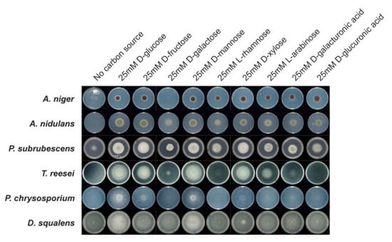 For growth phenotype analyses, strains were grown on minimal medium (MM) [34], with the exception of T. reesei and P. chrysosporium, which were grown on optimized medium for these species [35,36], on 1.5% (w/v) agar plates with one of nine monosaccharides (http://www.fung-growth.org/ (accessed on 1 April 2022)), including 25 mM D-glucose, D-fructose, D-galactose, D-mannose, L-rhamnose, D-xylose, L-arabinose, D-galacturonic acid and D-glucuronic acid. Growth was performed at 30 °C for both Aspergilli and 25 °C for the other species. Media with no carbon source was used as a control. If growth on a specific carbon source is the same as with no carbon source, it is considered as no growth. D-Glucose was used as an internal reference for the growth since it resulted in the best growth of all monosaccharides for the six species. Growth on other carbon sources was compared with growth on D-glucose, and the relative difference was compared between species. Growth was scored based on colony diameter and mycelium density. Growth was performed in duplicate, and no variation was observed between the duplicates for any species on any carbon source.