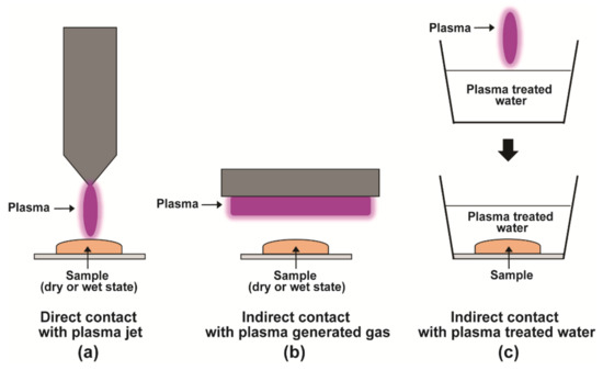Various strategies used for plasma treatment. Samples can be treated in a dry or wet state. (a) The sample is directly exposed to a plasma jet. (b) The sample is indirectly exposed to a gas produced from plasma. (c) The sample is submerged in plasma-treated water.