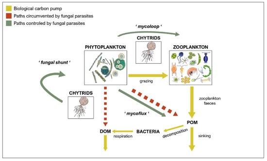 Fungal parasites are key components of the biological carbon pump. Fungal parasites take up phytoplankton-derived photosynthetic carbon (‘fungal shunt’) and thus lower the contribution to the DOM and POM pools. Through ‘mycoflux’, fungi control POM aggregation process, either decreasing (parasitic fungi), or increasing (saprotrophic fungi) the aggregation rate by promoting active aggregation via hyphae growth. Via fragmentation of large phytoplankton cells and redirecting carbon directly to zooplankton (‘mycoloop’) they can also indirectly modulate carbon sequestration via sinking zooplankton faeces.