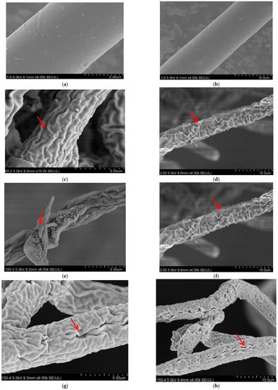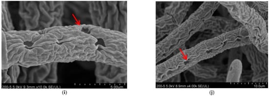 Scanning electron micrographs of R. solani. Hyphae exposed to lauric acid at concentrations of (a,b) 0 µg/mL, (c,d) 50 µg/mL, (e,f) 100 µg/mL, (g,h) 150 µg/mL, and (i,j) 200 µg/mL. Arrows and arrowheads indicate hyphae shrinkage and partial distortion.