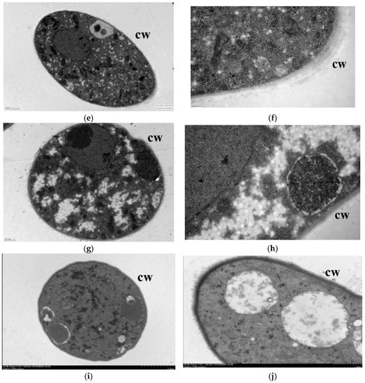 Transmission electron micrographs of R. solani. hyphae, where hyphae were exposed to agar with lauric acid at (a,b) 0 µg/mL, (c,d) 50 µg/mL, (e,f) 100 µg/mL, (g,h) 150 µg/mL, (i,j) 200 µg/mL. CW = cell wall.