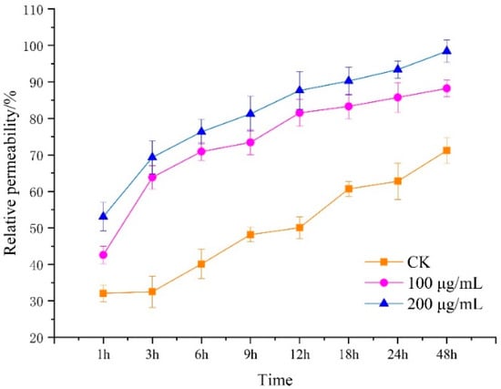 R. solani cake (5 mm) was taken and added to 100 mL of potato dextrose broth (PDB) medium and kept in a 28 °C shaker (150 r/h) for 24 h to form a uniform hyphal suspension. Lauric acid-incubated R. solani mycelia were gathered and washed twice for 2 min with sterilized water. One gram of the mycelia was placed in 15 mL centrifuge tubes containing one of three concentrations of lauric acid (0, 100, and 200 μg/mL). The background value of electrical conductivity was measured by a DDS-307 conductivity meter (J0); then after 0 h, 3 h, 6 h, 9 h, 12 h, 24 h, 48 h, according to the methods of Li et al. [], with some modifications, 10 mL of the mixture was taken and centrifuged (4000 rpm; 5 min). Its conductivity was measured, with supernatant J1. Then, the mixture was boiled for 15 min, cooled, and centrifuged. The conductivity measured in the supernatant was recorded as J2. Finally, the relative penetration of each time period was calculated. Permeabilities (P%) were calculated by the following formula:
