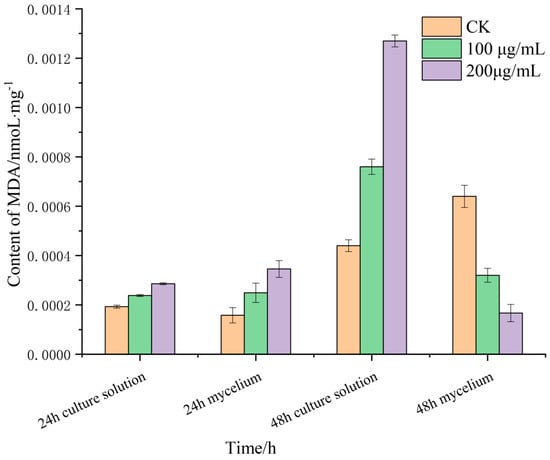 Malondialdehyde (MDA) is the product of membrane lipid peroxidation, and its content can reflect the degree of membrane lipid peroxidation, which is one of the important indicators of damage to the membrane system. MDA is a water-soluble small molecule, which is released into the extracellular culture medium when the cell membrane is damaged. The changes in the MDA content in the mycelia of R. solani after treatment with lauric acid are shown in Figure 4. After treatment with 100 and 200 µg/mL of lauric acid for 12 h, the MDA content in the mycelia and culture solution increased. The MDA content in the mycelia was higher than that of culture solution, and the difference increased with the increase in treatment concentration. After 24 h of treatment, the MDA content in the culture medium of 100 g/mL and 200 µg/mL lauric acid was higher than that of the blank control treatment, while the content in the mycelium of the untreated (CK) showed an increasing trend. It can be seen that the damage in the mycelium cell membrane caused by higher concentrations of lauric acid was significantly higher than that of the lower concentrations. Under a higher concentration of lauric acid, the MDA content in the culture medium was significantly higher than that in the hyphae, which indicated that lauric acid treatment caused cell membrane breakage, and MDA in the hyphae flowed out of the cells, and was released into the culture medium, consistent with the result that lauric acid treatment increased cell membrane permeability.